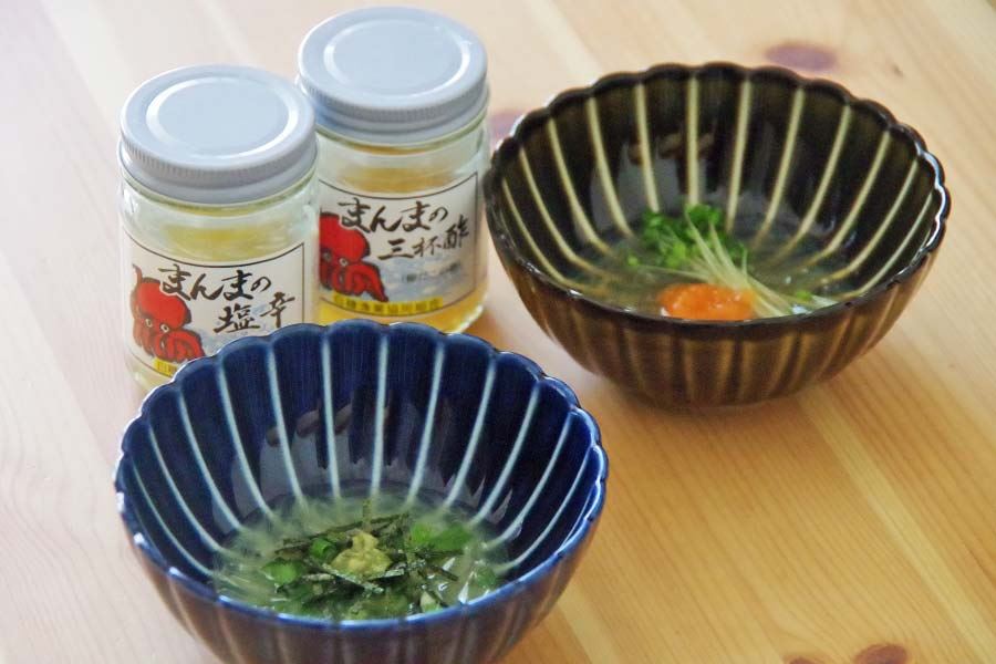 市場になかなか出回らない珍味「たこまんま」。お酒に合うとウワサのタコの卵巣を塩漬けした「まんまの塩辛」と、三杯酢に漬けた「まんまの三杯酢」を食べ比べてみました