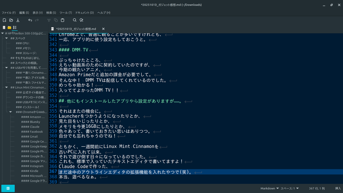 まだ途中のアウトラインエディタの拡張機能を入れたやつで(笑)。