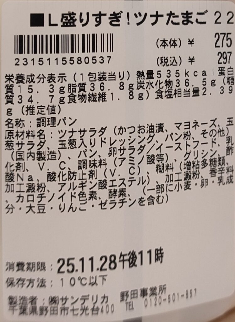 『盛りすぎ!ツナたまごサンド』297円(税込)| 535kcal