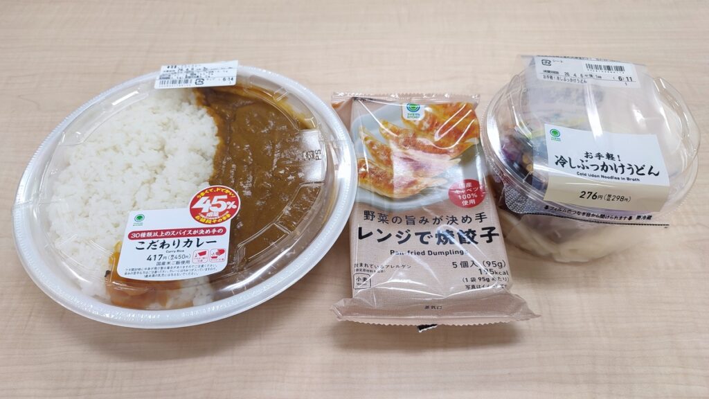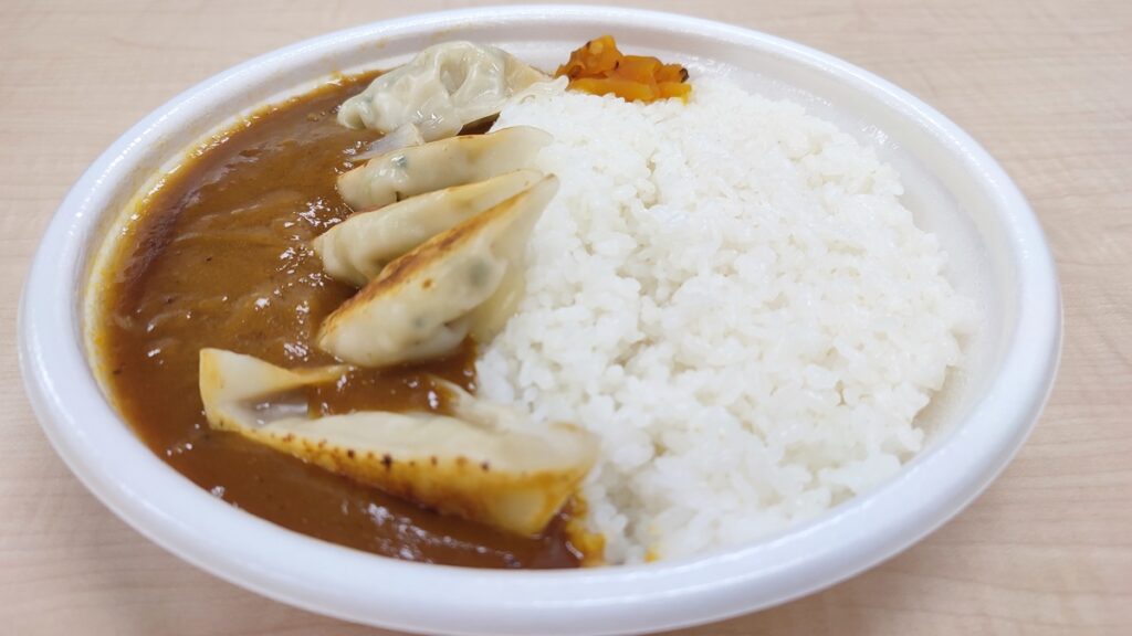 『【なぜか45%増量作戦】30種類以上のスパイスが決め手のこだわりカレー』450円(税込)| 858kcal / 『野菜の旨みが決め手レンジで焼餃子』170円(税込)| 195kcal