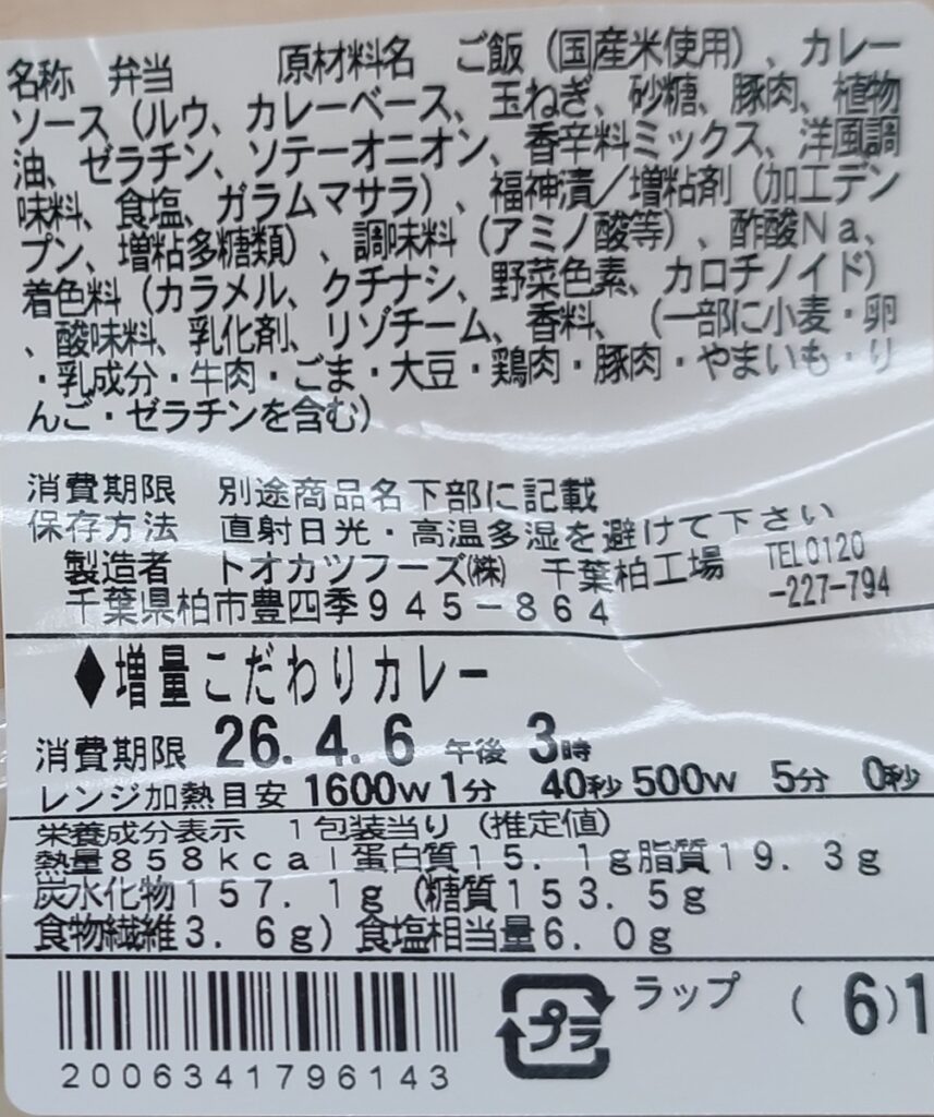 カレー:トオカツフーズ株式会社 千葉柏工場製造。