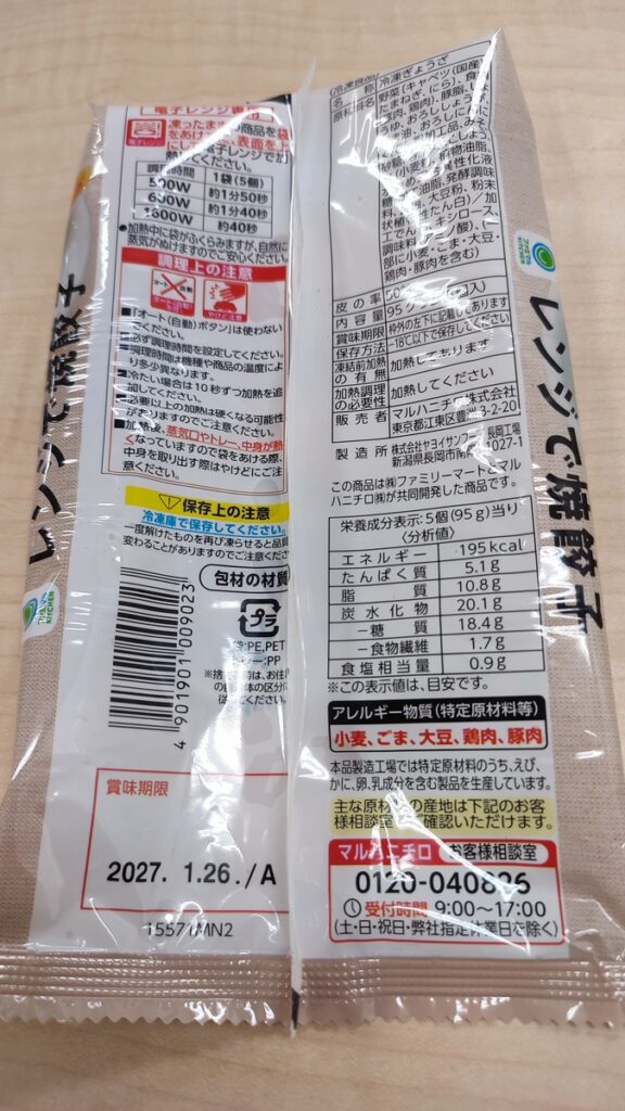餃子:株式会社ヤヨイサンフーズ 長岡工場製造。