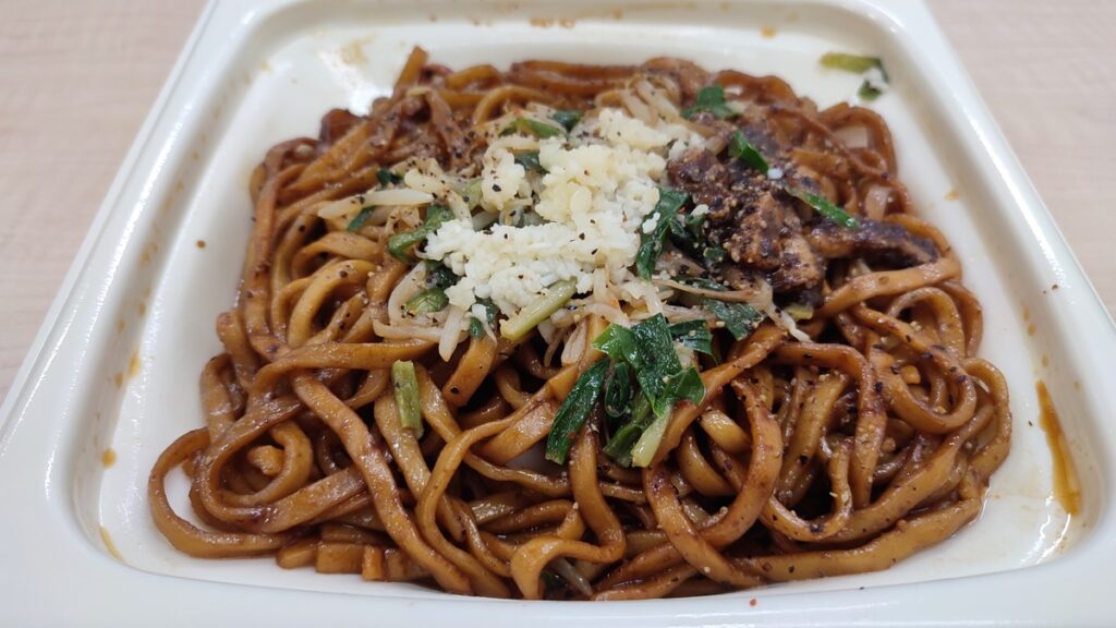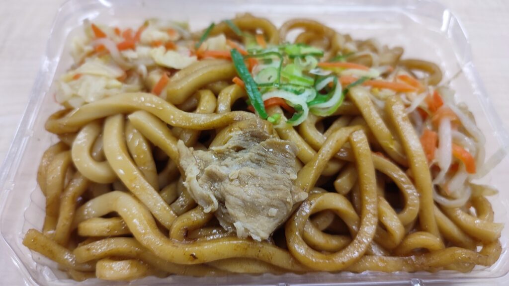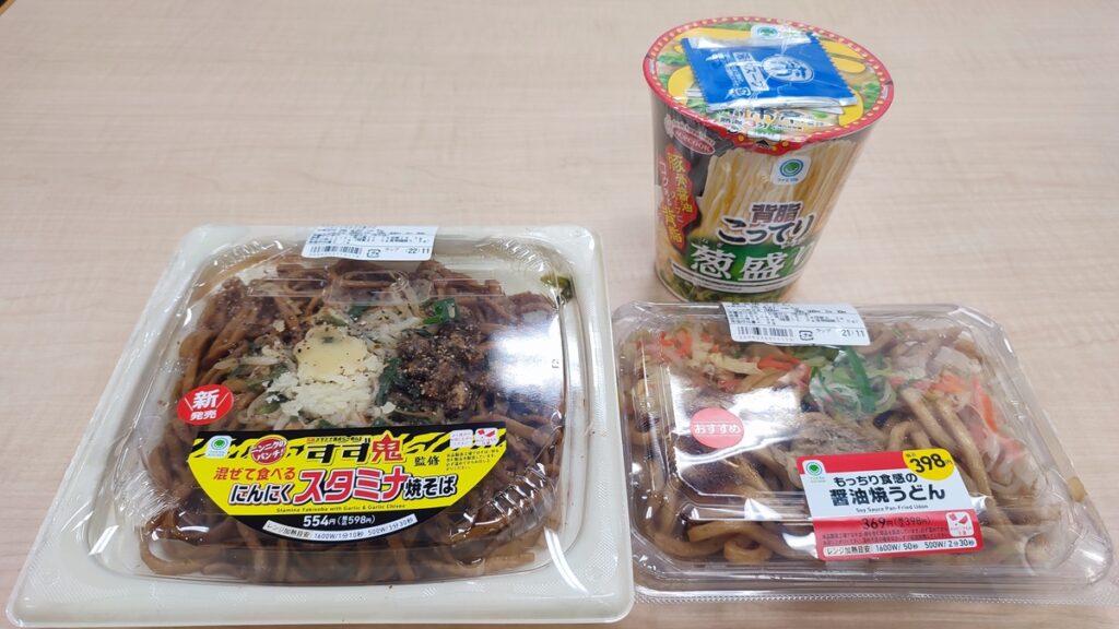 今日のコンビニごはん。ファミリーマート『すず鬼監修 混ぜて食べる にんにくスタミナ焼そば』『もっちり食感の醤油焼うどん』『来来亭 背脂こってりラーメン葱盛り』感想。