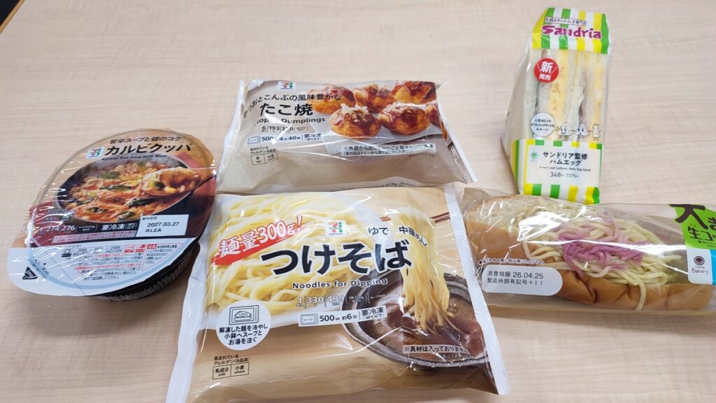 今日のコンビニごはん。セブン-イレブン『7プレミアム カルビクッパ』『7プレミアム たこ焼』『7プレミアム つけそば』、ファミリーマート『【自慢のハムサンド】サンドリア監修 ハムエッグサンド』『大きな生コッペパン(塩焼きそば)』感想。